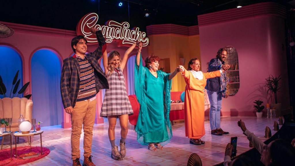 Con préstamos de la telenovela y la comedia familiar de los años '70 y '80, cándida pero interceptada por la autoparodia, "Coqueluche" combina figuras del teatro y la tevé, y pone a sus personajes a interactuar en un living de colores saturados y ambientación "kitsch", entre música pop y héroes y antihéroes enfrentados por la nobleza o la vileza de sus emociones.