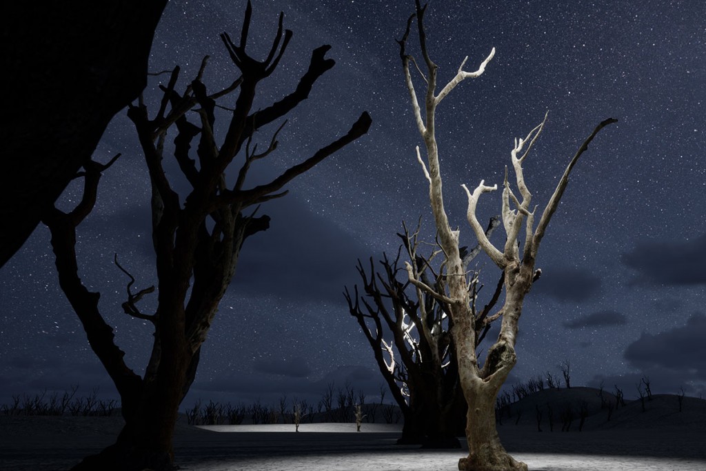 Desarrollada mediante animación 3D y fotogrametría, la pieza explora la interacción entre materiales y sensaciones: madera carbonizada, fuego y luz roja, texturas del monte, y la resonancia de composiciones sonoras en diálogo con el entorno.