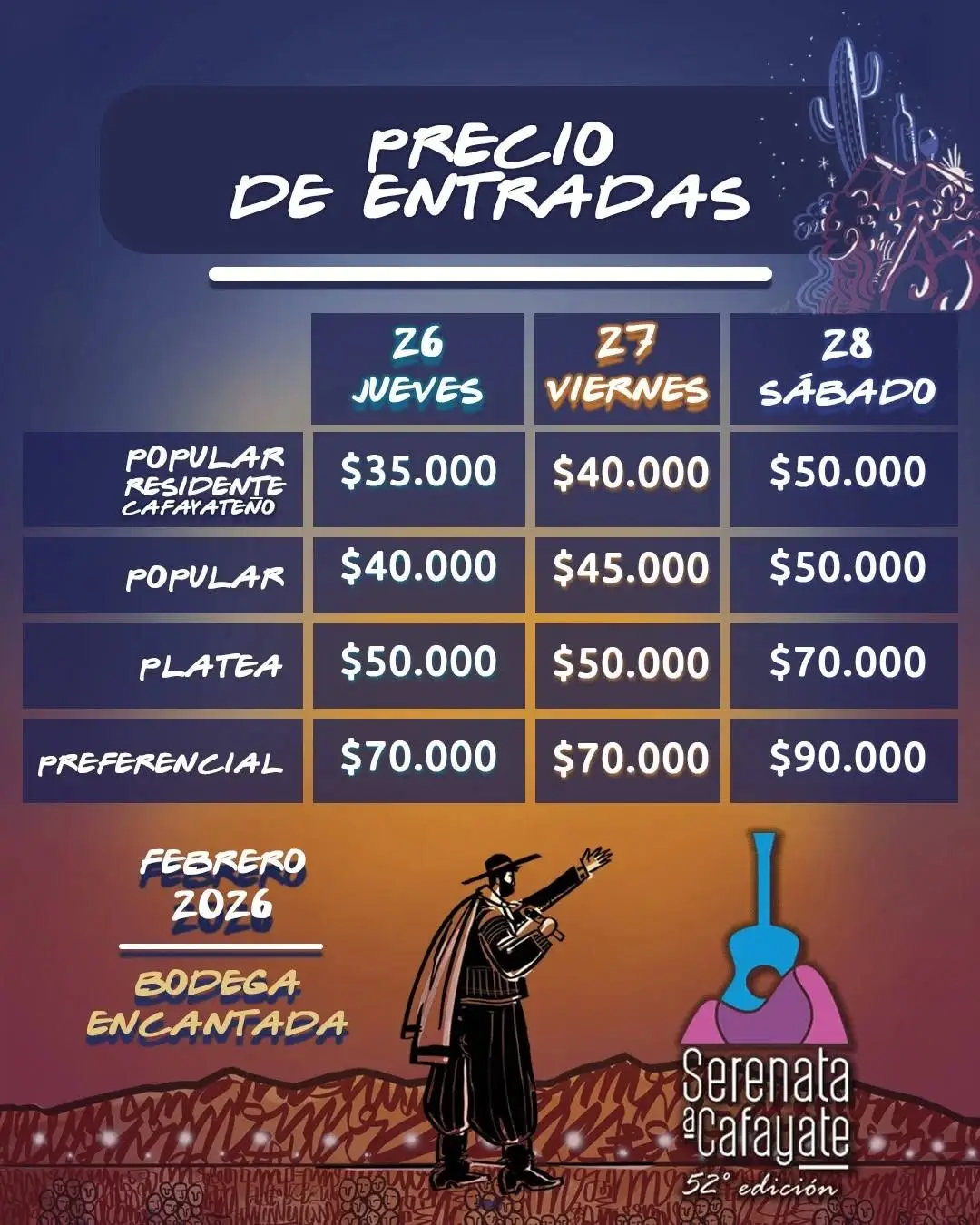 La primera noche, el jueves 26, tendrá en escena a Los Nocheros, Jorge Rojas, Ahyré y Sergio Galleguillo, junto a artistas emergentes y ballets como Sol Calchaquí y El Algarrobal, además del ganador del Pre-Serenata.