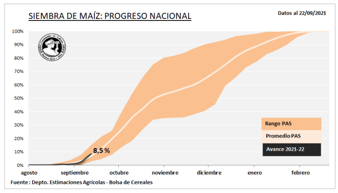 La siembra nacional de maiz de la campaña 2021/22, de acuerdo a los datos de la Bolsa de Cereales de Buenos Aires, ya progresó sobre el 8,5% de las 7,1 millones de hectáreas previstas para esta campaña.