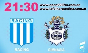 Hoy a partir de las 21.30 horas con el equipo deportivo de OPEN 99.3 FM y La Folk Argentina,con los relatos Luis Parra y Comentarios de Cristian Menéndez Barrios,Racing Club, que está cuarto a nueve puntos del puntero Boca, con un partido pendiente que le está ganando a Godoy Cruz 1-0 a falta de 65 minutos, será local ante Gimnasia, que pese a sufrir a dos derrotas seguidas tiene chances de luchar por una plaza en la Liguilla para la Libertadores, en uno de los cinco partidos a jugarse hoy por la 23ra. fecha del torneo de Primera División.