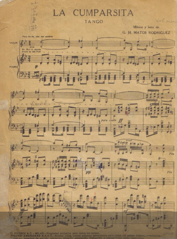 Todo empezó en el carnaval de 1916, en Montevideo. Gerardo Matos Rodríguez, que todavía no sabía música, escribió una marchita para La comparsa, la peña estudiantil de la que formaba parte. El título se lo puso un mozo italiano que se burlaba de la importancia de La comparsa y no podía pronunciar “comparsita”. Y quedó Cumparsita, a secas, como primer nombre. El “la” se lo agregaron, como a las grandes divas, los que hablaban de ella.