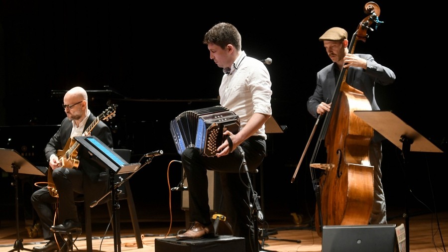 Sin piano ni violín pero incorporando la guitarra de Alejandro Schwarz (Argentina-Francia), el más nuevo integrante de la agrupación, llegó la estupenda “Bandoneón, guitarra y bajo” que Piazzolla compuso para ese trío de Rovira.