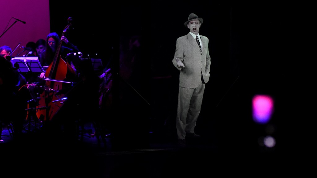 La proyección de un holograma sobre la escenografía permite ver a Gardel aparecer en la puerta de un bar. Desde la platea la ilusión es completa, la figura se presenta de pie y simulando un tamaño real. Lo tenemos ahí, ante nuestros ojos, al morocho del abast