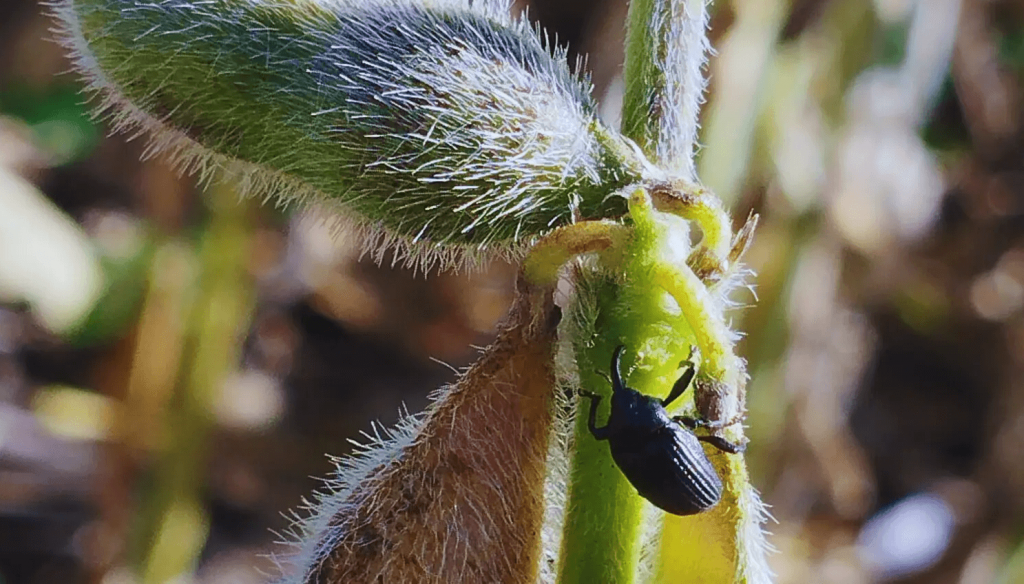 Cabe recordar que el picudo negro de la vaina de soja afecta de forma directa el grano, ya que las hembras colocan huevos en el interior de las vainas y las larvas se alimentan de las semillas, causando daños parciales o totales.