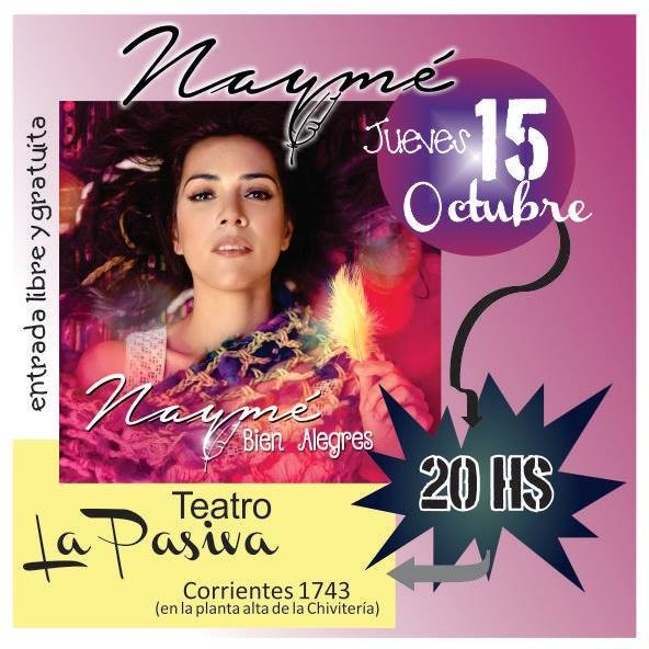 Naymé, oriunda de venado Tuerto posee un estilo de folklore urbano, rompiendo todo lo conocido en el sonido de sus canciones expresa una sensualidad poco conocida dentro del género, presentará su primer material discográfico el día 15 de octubre a las 20.00, en el teatro "La Pasiva" (Corrientes 1743, en la planta alta de la Chivitería).
