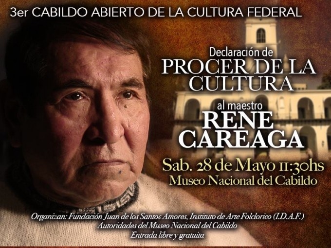 El Sábado 28 de Mayo del corriente año, la Fundación “Juan de los Santos Amores” y el Instituto de Arte Folclórico I.D.A.F. distinguirá al autor y compositor boliviano, Sr. Rene Careaga con el título de “Prócer de la Cultura” valorando la trayectoria impecable como artista recorriendo la Patria, defendiendo la cultura y tradición a través de su arte.