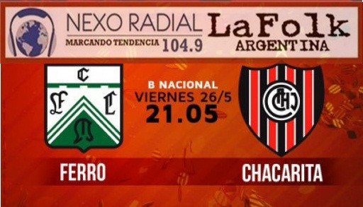 Desde las 21.05 con el equipo deportivo de NEXO 104.9 FM y LA FOLK ARGENTINA con el relato de Luis Parra, comentarios Cristian Menendez y Lucas Gomez, campo de juego Lucas Ferraro, foto Daniel Gutierrez. Ferro y Chacarita se verán las caras en Caballito, en el comienzo de la 35ª fecha de la B Nacional. El Verde marcha 5º, mientras que el Funebrero está 3º y a cinco unidades de la zona de ascenso directo.