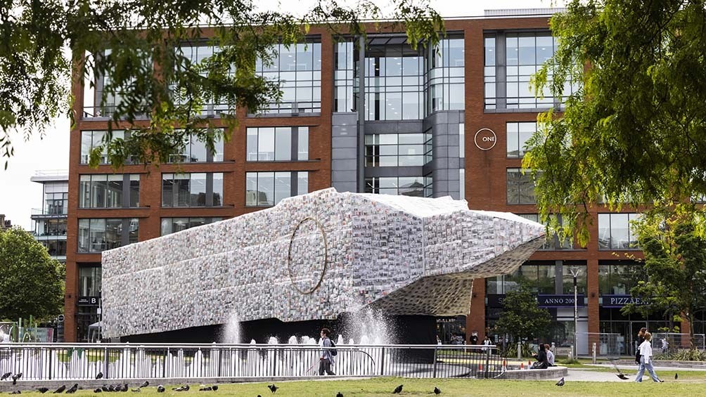 El Big Ben, icónico símbolo que se encuentra en Westminster, será replicado en Manchester, en los jardines de Piccadilly, como una obra de arte participativa, de 42 metros, recubierta de 20.000 ejemplares de libros que han dado forma a la política británica.