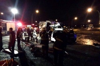 El siniestro, en el que participaron un automóvil Chevrolet Meriva y un camión Mercedes Benz de la planta avícola "¡Qué rico!", que transportaba mercadería faenada, ocurrió alrededor de las 0.30, en el kilómetro 144 de la ruta nacional 8, a la altura de la entrada de la Empresa Granja Tres Arroyos, informó a Télam, Hugo Almada, segundo jefe de Bomberos Voluntarios de Capitán Sarmiento.